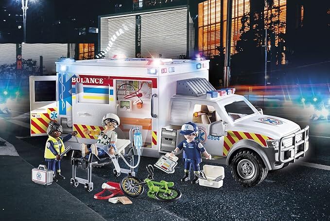 The brave rescue team is always ready help people in need with the Ambulance with Lights and Sound. As soon as an emergency call comes in, the paramedics grab their gear and jump into the rescue vehicle, using the functioning blue lights and siren to alert others on the road to move aside. At the scene, the paramedics examine the injured cyclist and apply a head bandage. Then, the patient is lifted onto the stretcher and safely secured for the ride to the hospital. Open the rear doors of the ambulance to place the stretcher inside. Now it's off to the hospital for further examination. Easily access the ambulance's interior thanks to the removable roofs. The vehicles has various compartments for storing all the necessary medical equipment. Set includes three figures, ambulance, bicycle, stretcher, medical kit, patient chart, traffic cones, and other accessories.