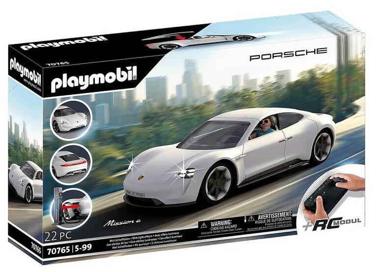 Electric vehicle with RC control, cool lighting effects and charging station. 4 x 1.5 V AAA batteries required for light module. 3 x 1.5 V AAA batteries required for remote control. Vehicle dimensions: 27.5 x 11 x 7.5cm (LxDxH)Check out the ingenious Porsche Mission E - the perfect combination of high-performance technology and sports car design. The Porsche Mission E brings electric mobility into the playroom. Sports car fans will be thrilled not only by the cool front lighting, but also by the unique light design. Of course, the PLAYMOBIL Porsche Mission E model also features a continuous light arc at the rear. Even the charging process of the electric sports car can be recreated, just like in real life. Thanks to the integrated RC remote control, little sports car fans can speed off immediately. Next-generation racing fun! The playset includes a Porsche Mission E, a cool PLAYMOBIL figure, a charging column with charging cable, an RC remote control and other exciting extras for fast-paced racing action. Seven 1.5 V AAA batteries are required for the light module and remote control (not included).