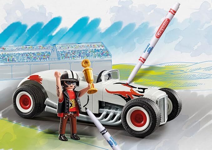 Bring colour into play with PLAYMOBIL Color! This Hot Rod attracts all eyes and can be customised and embellished as desired with the included markers. Whether dangerous flames, dynamic stripes or skid marks: the color can be easily washed off again - for never-ending fun. Includes ramp with oil drum.