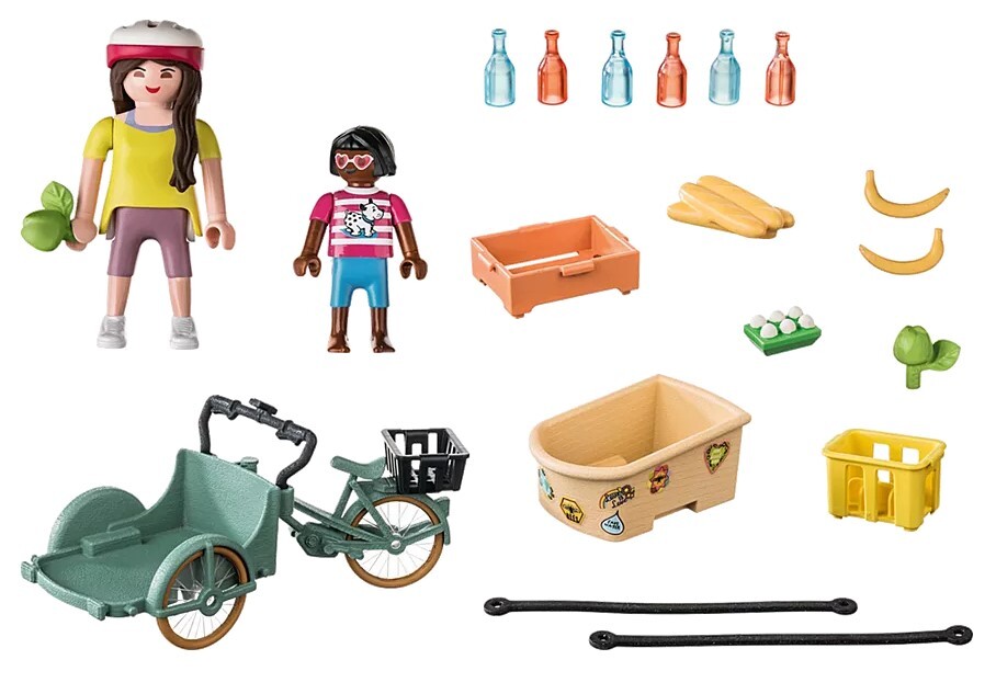 The 28-piece toy set includes two PLAYMOBIL figures, a cargo bike with interchangeable transport tray, a vegetable box, a drinks crate with bottles and other extras.