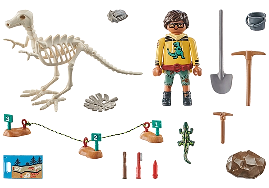 Set includes 1 male figure, 1 lizard, 1 assemblable dinoskeleton, 1 barrier, 1 map, 1 shovel, 1 pickaxe, 1 bucket with utensils, 1 rock, 2 fossils and 1 pencil.