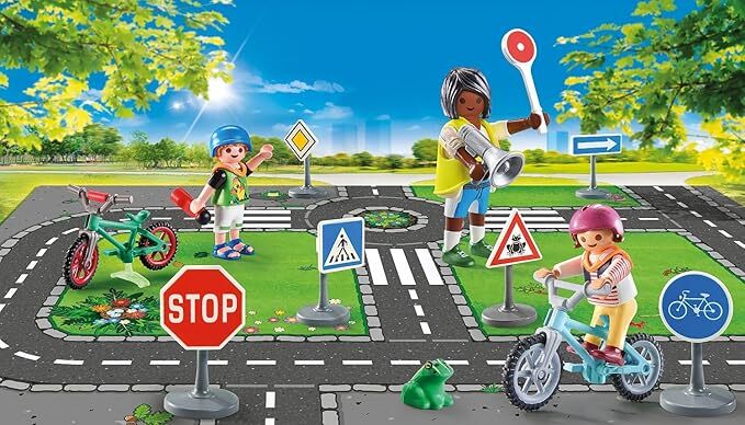 The toy set includes three PLAYMOBIL figures, six traffic signs, two bicycles, a megaphone, a trowel and other great extras. An ideal gift or souvenir for the start of school or for all clever children aged 4 and up.