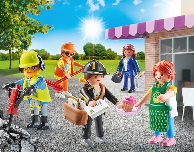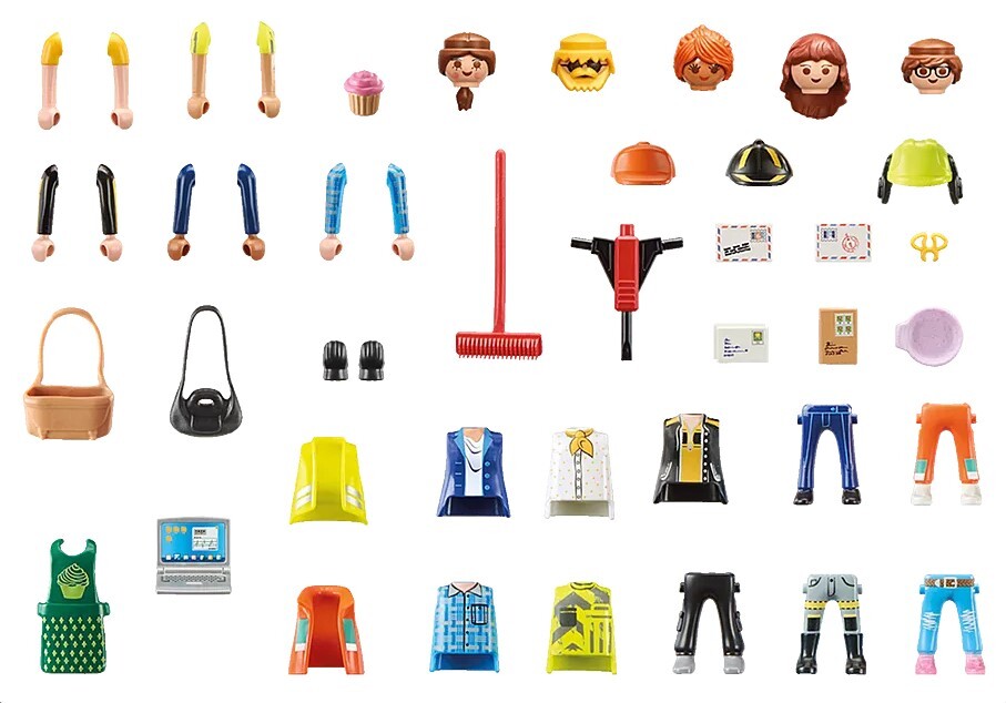 Set includes 2 men figures, 3 women figures, 1 cupcake, 1 tray, 1 laptop, 1 suitcase, 1 bag, 4 letters, 1 mailman bag, 1 helmet, 1 jackhammer, 1 broom, 1 cap