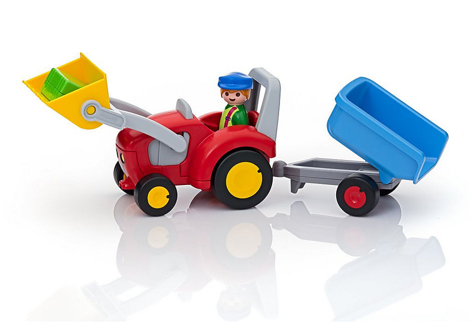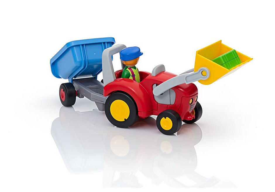 Playmobil 1.2.3's Tractor with Trailer set brings the thrill of farm life to playtime. Your little one can place the farmer figure in the seat of the tractor, and interact with movable elements like the lifting arm and tilting trailer. The tractor also fits through the gate of the Playmobil 1.2.3 Take-Along Farm, making this tractor and trailer set compatible with other Playmobil sets.