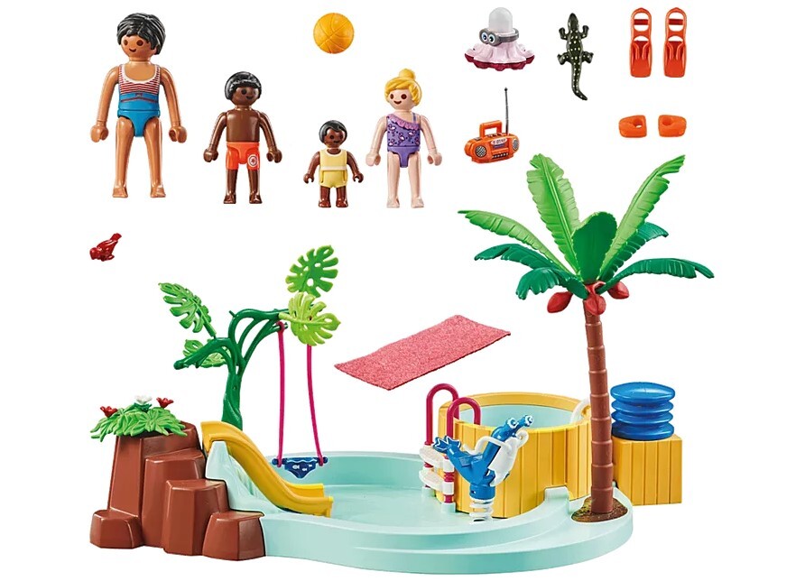 Set includes 1 woman figure, 3 child figures, 1 bird, 1 children's pool, 1 whirlpool with pump, 1 beach ball, 1 swimming buoy, 1 radio, 1 palm tree, 1 swing, 1 fins, 2 water wings, 3 flowers