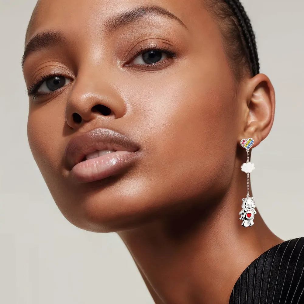 Playfully dangle a piece of childhood nostalgia with these adorable Tenderheart Care Bear drop earrings. Featuring the beloved bear alongside whimsical clouds and crysal rainbow hearts, they're the perfect accessory to spread caring vibes wherever you go. A charming touch of Care-a-Lot for your everyday style!