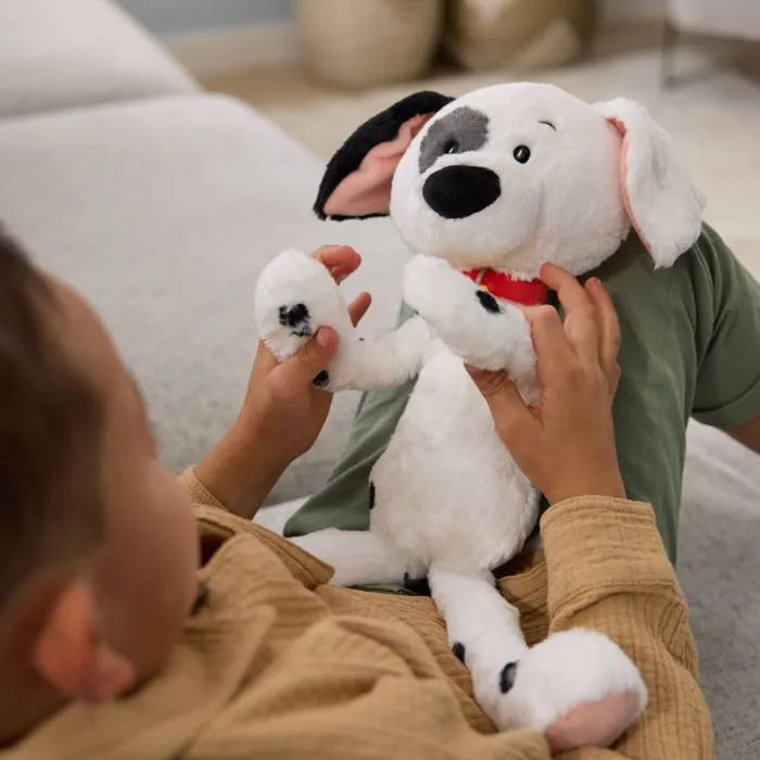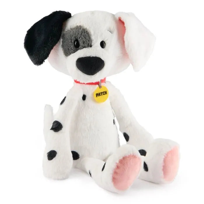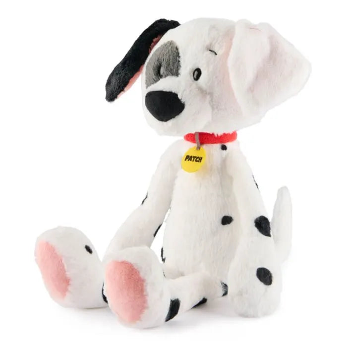 This adorable plush features Patch with authentic character details from the 101 Dalmatians film, including Patch's namesake black spot over his eye, his black ears, and his soft white plush coat in a classic spotted pattern. Patch also has soft peachy-pink paws, a large black plush nose, and he wears an iconic bright red dog collar adorned with a yellow felt Patch nametag. Patch's curved tail points upwards, like an excited puppy wagging his tail.