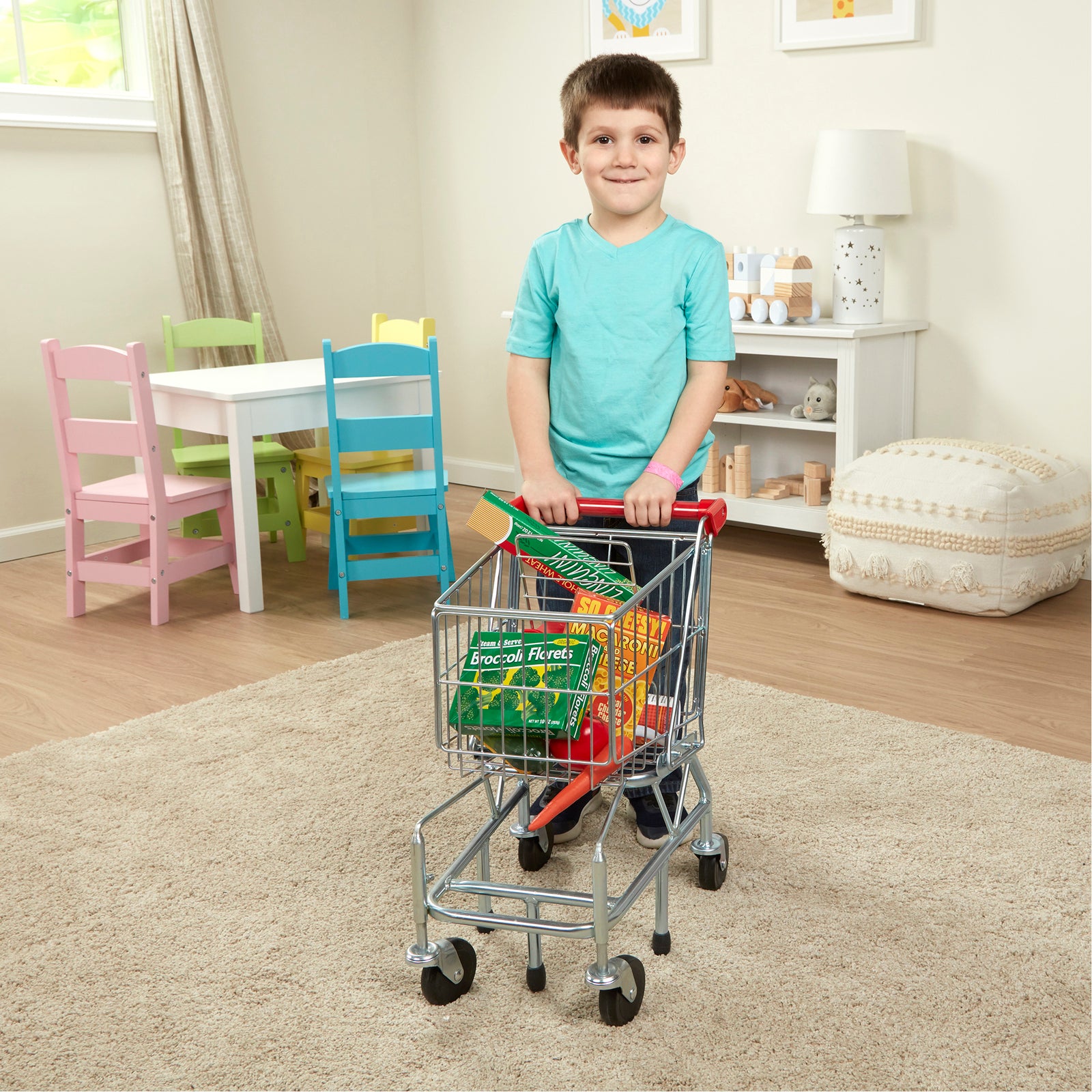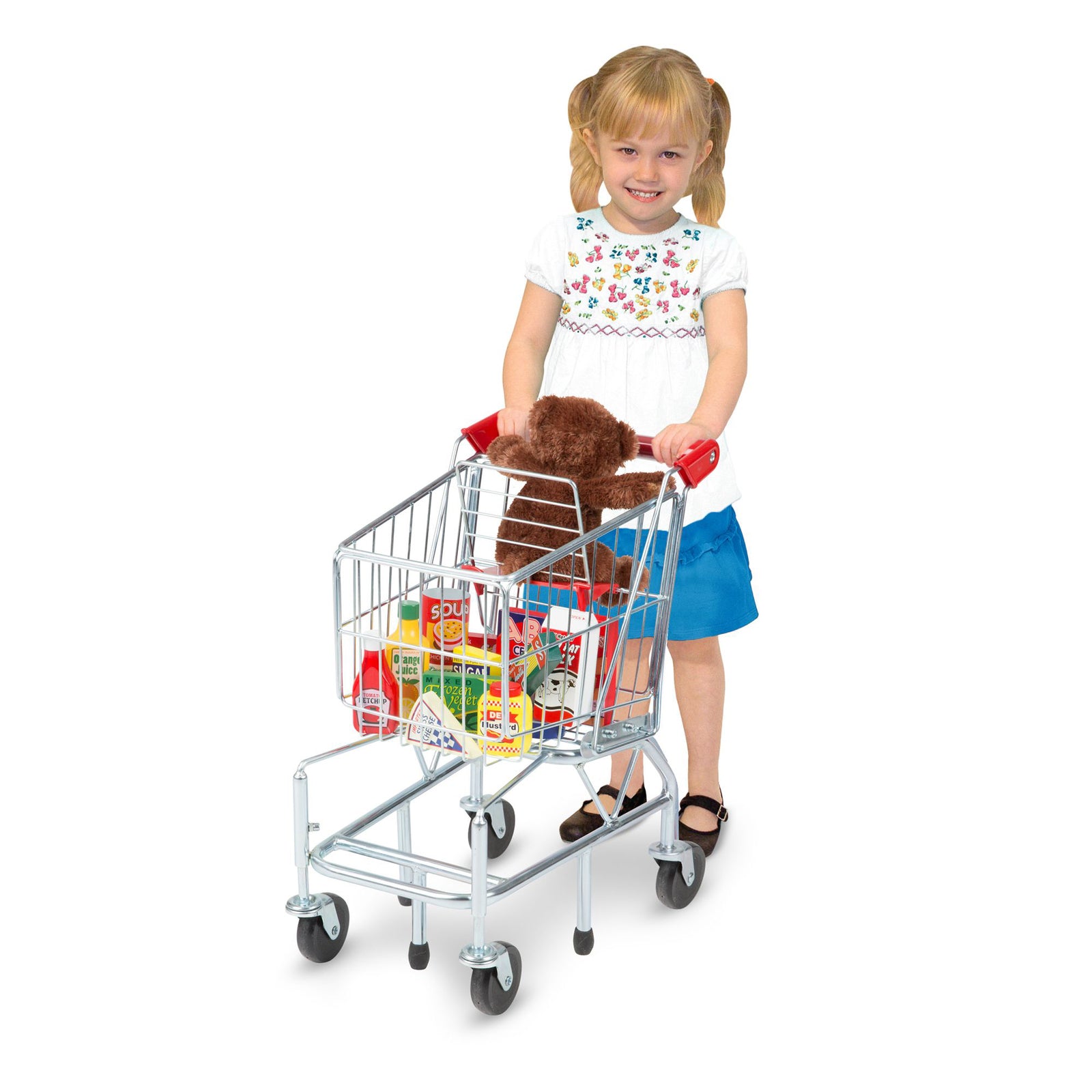- Realistic, kid-sized metal shopping cart with pivoting front wheels