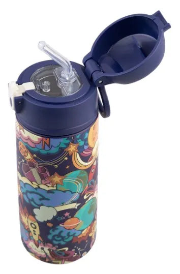 Designed for convenience, it comes with a flip-top lid and a removable silicone sipper straw, making sipping easy and cleaning a breeze. Built with double wall vacuum insulation technology, this bottle keeps drinks cold for up to 12 hours, ensuring refreshment throughout the day. Plus, the insulation prevents condensation, so no more soggy backpacks! Crafted from premium 18/8 stainless steel, its rust-resistant, odour-free, and incredibly durable - ready to handle anything kids throw at it.