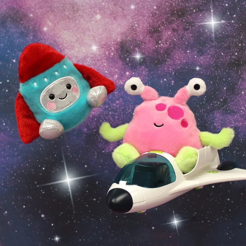 Mars Rocket Ship is an eye-catching plush, with a bright aqua-blue body and a fiery red rocket top, symbolizing his burning desire to soar into space. His silver patches resemble the titanium pieces he's made of, and his face beams with the optimism of a rocket ready to launch.
