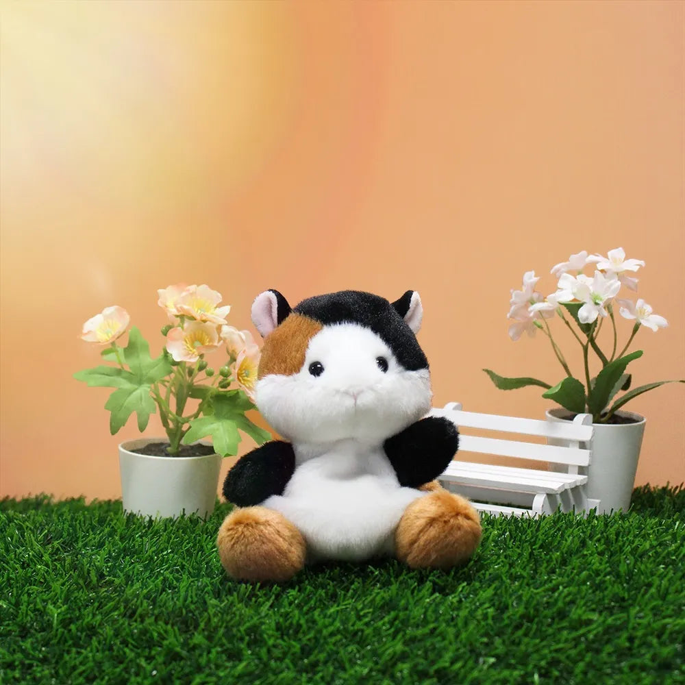 Nutmeg features a soft, tri-color coat with patches of black, white, and orange. His curious little eyes and perky ears make him an adorable sight, perfect for any guinea pig enthusiast or plush collector.