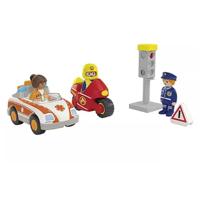 Set includes 1 woman doctor, 1 firefighter, 1 policeman, 1 emergency medical car, 1 firefighter motor bike, 1 traffic light, 1 emergency medial kit, 1 warning triangle.